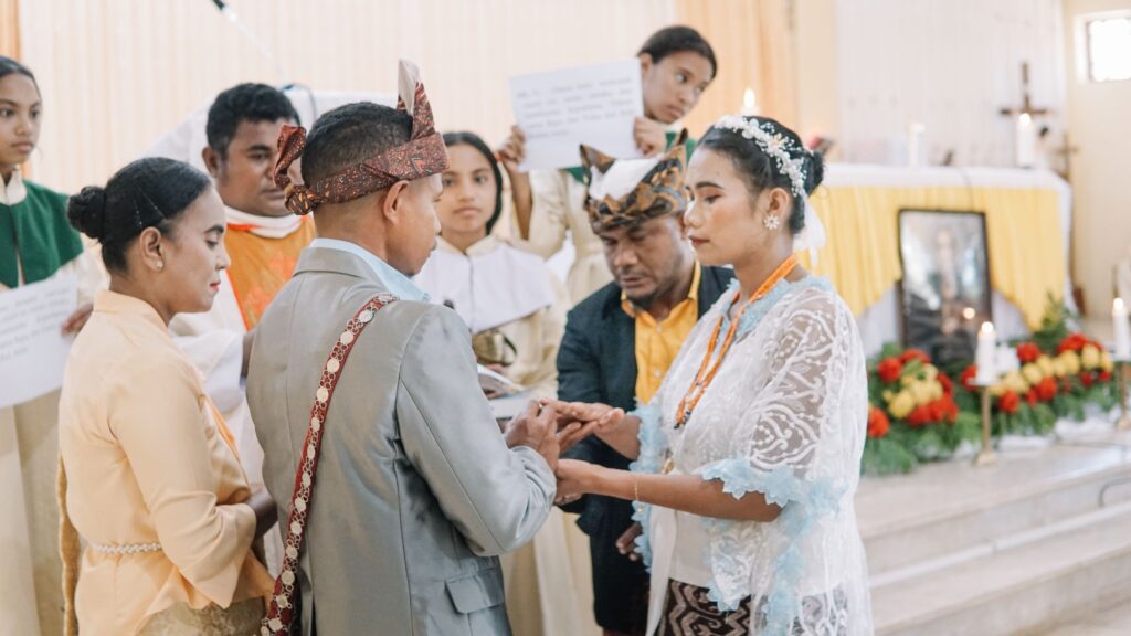 Salah satu pasangan suami istri saat melangsungkan prosesi pasang cincin dalam misa pernikahan masal tersebut, Sabtu (25/10/2025). (Foto : Edwin/Kominfotik TTU).