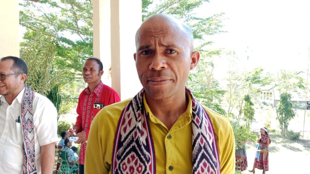 Anggota DPRD TTU, Hieronimus Joni Tulasi, S.H, saat diwawancarai setelah pelaksanaan misa pernikahan massal tersebut, Sabtu (25/10/2025). (Foto : Apson/Kominfotik TTU).