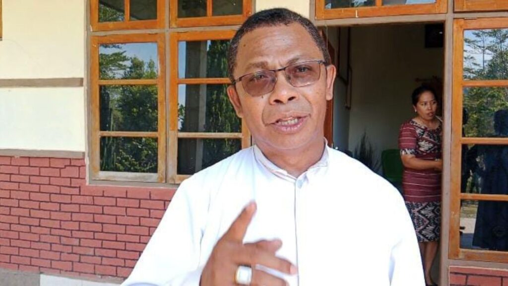 Pastor Paroki St. Antonius Maria Claret Oenopu, Pater Petrus Taneo, CMF, saat diwawancarai setelah pelaksanaan misa pernikahan massal tersebut, Sabtu (25/10/2025). (Foto : Apson/Kominfotik TTU).