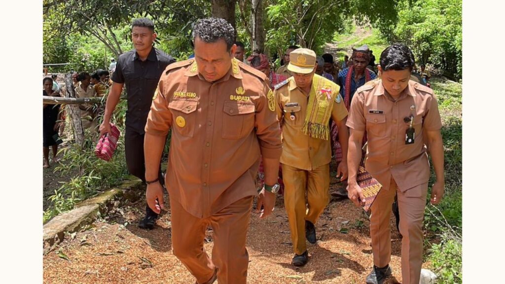 Bupati TTU saat menelusuri jalan menuju ke rumah Bapak Hendrikus Mataubana di Desa Sainiup, Kecamatan Biboki Selatan, Kabupaten TTU, Selasa (2/12/2025).