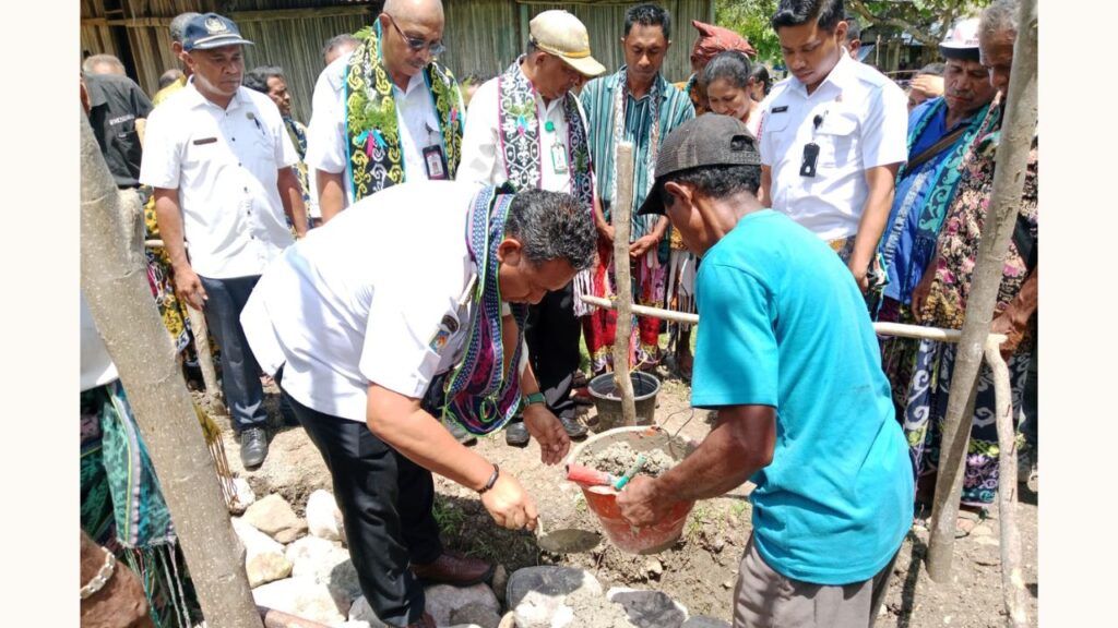 Bupati TTU saat melakukan peletakan batu pertama Rumah Layak Huni – Terima Kunci Plus Sanitasi (RLH–TULUS) di Desa Fafinesu C, Kecamatan Insana Fafinesu, Rabu (3/12/2025). Foto : Apson/Kominfotik TTU