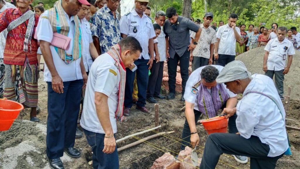 Bupati Falent saat melakukan peletakan batu pertama pembangunan Rumah Layak Huni – Terima Kunci Plus Sanitasi (RLH–TULUS) bagi Bapak Petrus Nahak Nino dan keluarga, Rabu (26/11/2025). Foto : Apson/Kominfotik TTU