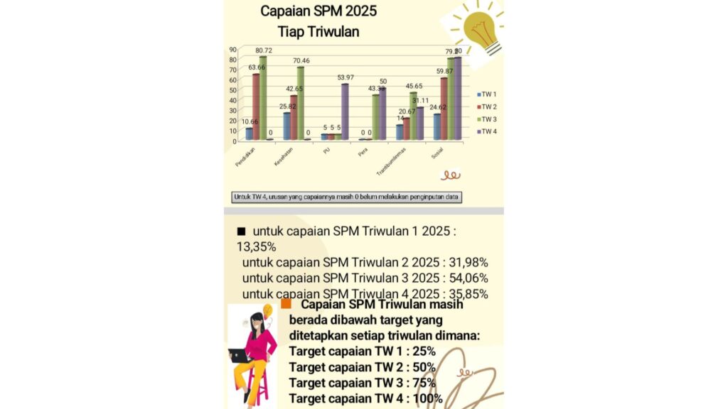 Tercatat, data sementara untuk capaian SPM tahun 2025 tingkat kabupaten TTU, triwulan (TW) 1 mencapai 13,35%, TW 2 : 31,98%, TW 3 : 54,06% dan TW 4 : 35,85%. Sementara itu, target capaian SPM tingkat Kabupaten TTU tahun 2025 TW 1 : 25%, TW 2 : 50%, TW 3 : 75% dan TW 4 : 100%.