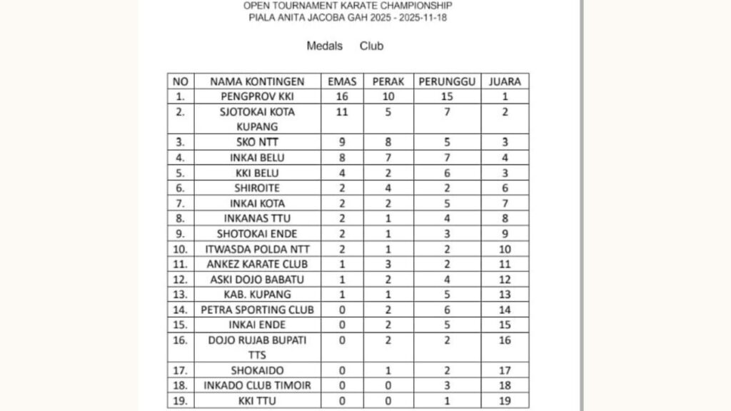 KEFAMENANU NEWS, – Institut Karate-Do Indonesia (Inkai) Cabang Timor Tengah Utara (TTU) kembali menorehkan prestasi membanggakan dengan meraih medali emas pada ajang Open Tournament Championship Piala Anita Jacoba Gah yang berlangsung di GOR Flobamora Oepoi, Kupang, 18–19 November 2025.